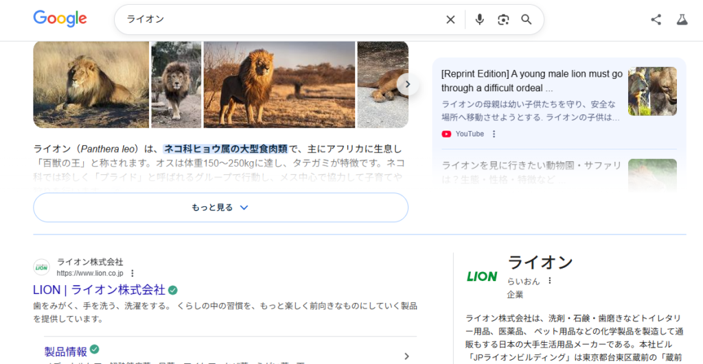 たとえば「ライオン」で検索すると検索結果の1ページ目には「動物のライオン」と「企業のLION」が表示されます。